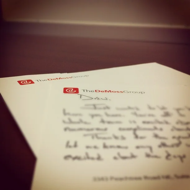 It works at the office too. One of my company higher ups hand-wrote a note of encouragement in my first month in my new role at The DeMoss Group. He could've written an email. He could've left a voicemail. However, the gesture of writing something out made that act of appreciation just "stick" more. My boss Mark even writes in his book how some of the most successful people he knows are avid letter writers.
