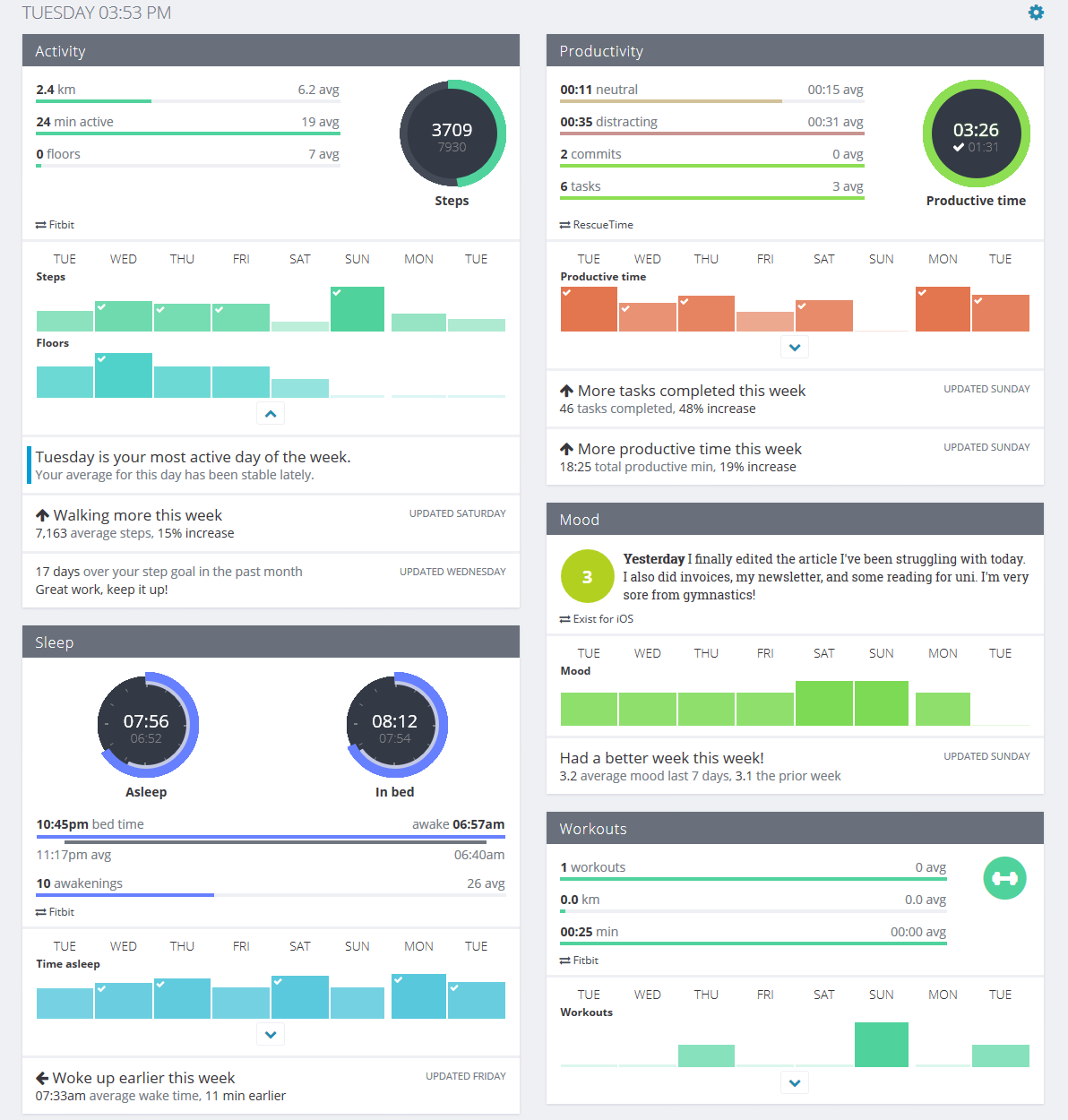Todoist: Do I get more tasks done when I sleep longer? I think between checking boxes on Todoist and looking at a productivity score on Rescue Time, I may be able to see how my other life habits help my work focus over time.